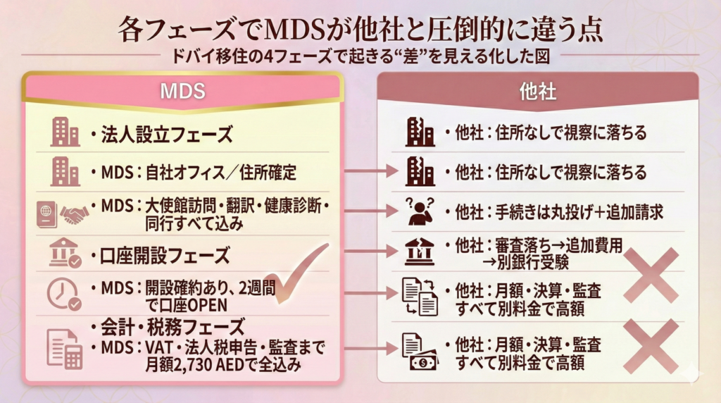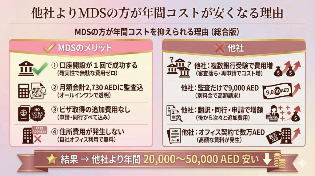 他社では口座開設に失敗し、別の銀行を再申請するだけで数千〜数万AED発生することも珍しくありません。